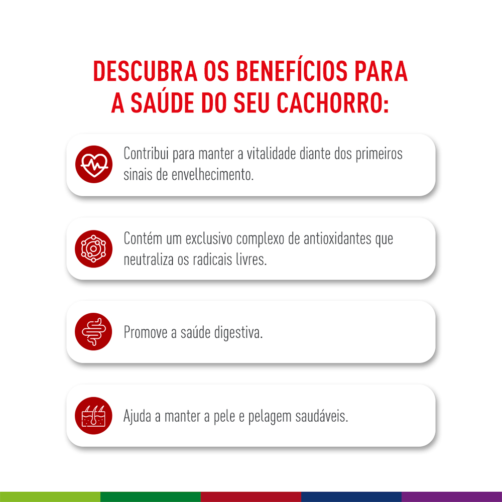 – Indicada para cães a partir dos 7 anos de idade;- Ideal para os pets de médio porte;- Ajuda a manter a vitalidade frente aos primeiros sinais de envelhecimento;- Contém um exclusivo complexo de antioxidantes para ajudar a neutralizar os radicais livres;- Apoia a saúde digestiva;- Ajuda a manter uma pele e pelagem saudáveis;- Disponível em embalagem com 12kg.